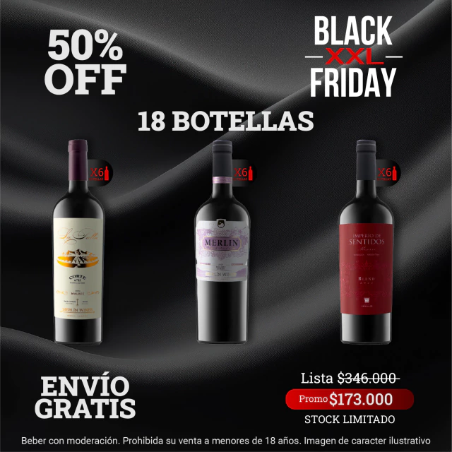 - 6 Botellas de MERLIN INSPIRACIÓN MALBEC / SYRAH – Criado en vasijas de concreto – Bodega Merlín Wines. Maridaje sugerido: Matambre a la pizza o shawarma.